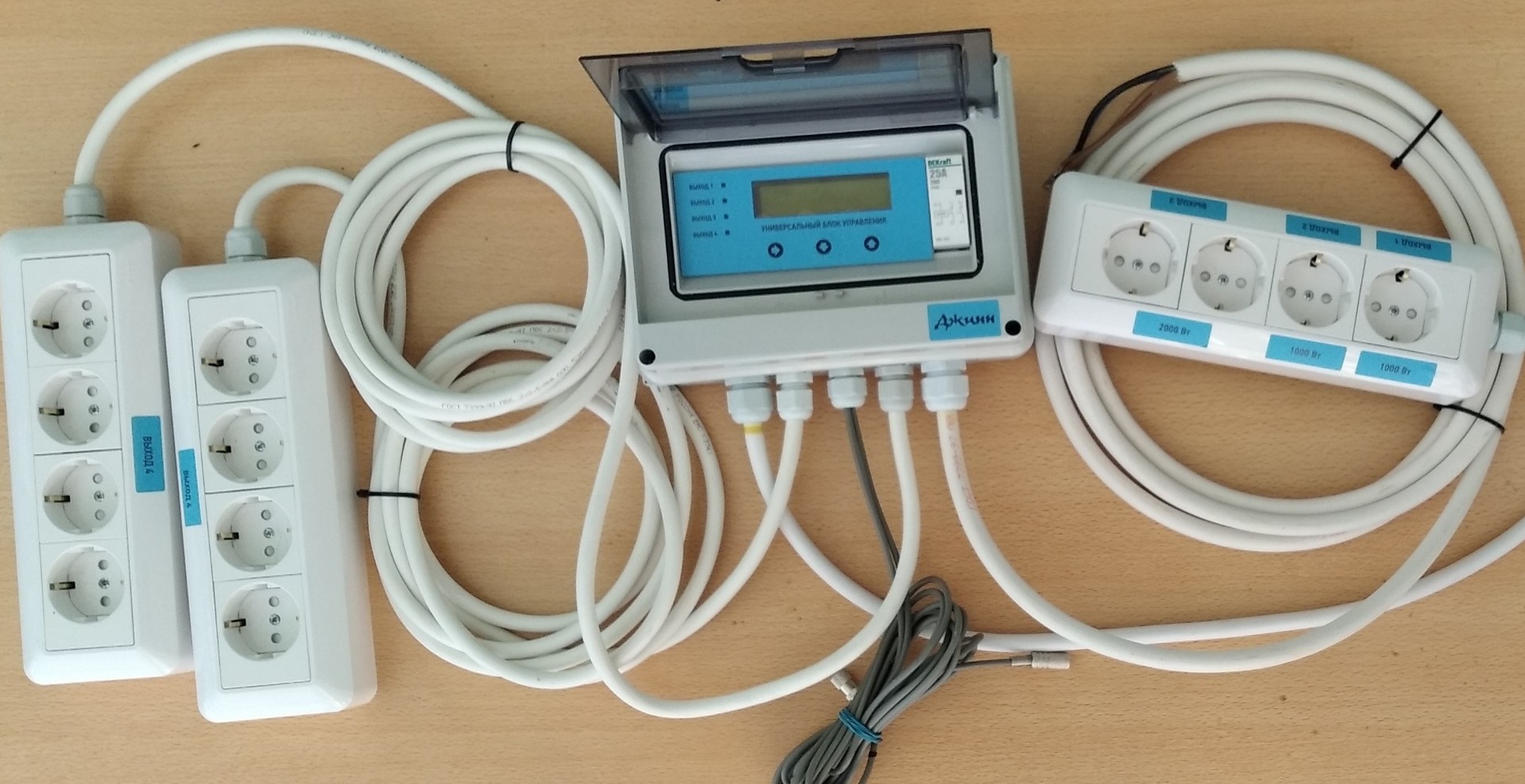 Универсальный блок «Джинн» имеет четыре силовых выхода, рассчитанных на напряжение 220 В. Мощность выходов от 1000 Вт до 8000 Вт. Каждый выход можно отдельно настроить на работу по таймеру, времени и температуре.