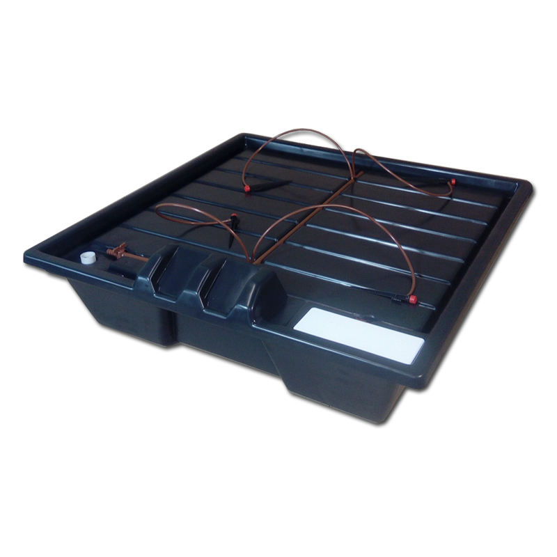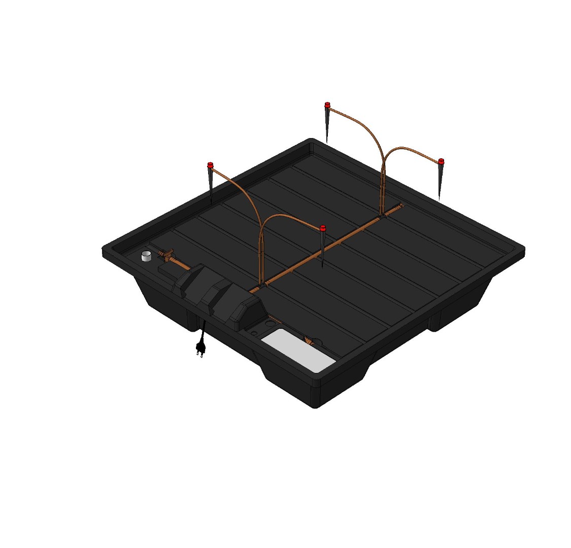 1. Система представляет собой квадратный бак с крышкой, которая является одновременно поддоном. Поддон имеет дренажный слив, ведущий в бак, и систему подачи раствора (капельную линию). Раствор при помощи помпы подается из бака и орошает стоящие на поддоне емкости (Air Pot, GrowBag, ведра и пр.) с растениями.
