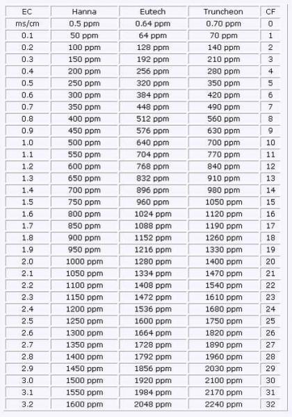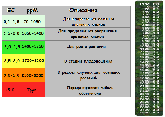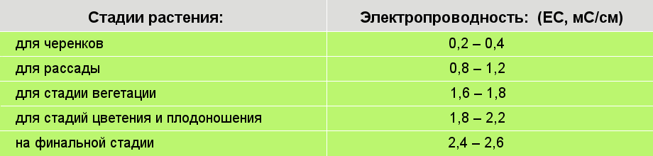 Электропроводность (EC) или концентрация минеральных солей - это один из инструментов нашего контроля над растениями. Зная величину ЕС вашего раствора, вы способны управлять скоростью созревания, качеством, сладостью вкуса и размером плодов. Если поместить укорененный черенок в раствор с более высокой проводимостью, стебель растения получится с малым межузловым расстоянием, отличающийся от материнского растения. А если проводимость слишком низкая, у вас вырастет более вытянутое растение. В таблице проводимости даются нормы электропроводности раствора для различных стадий роста растения